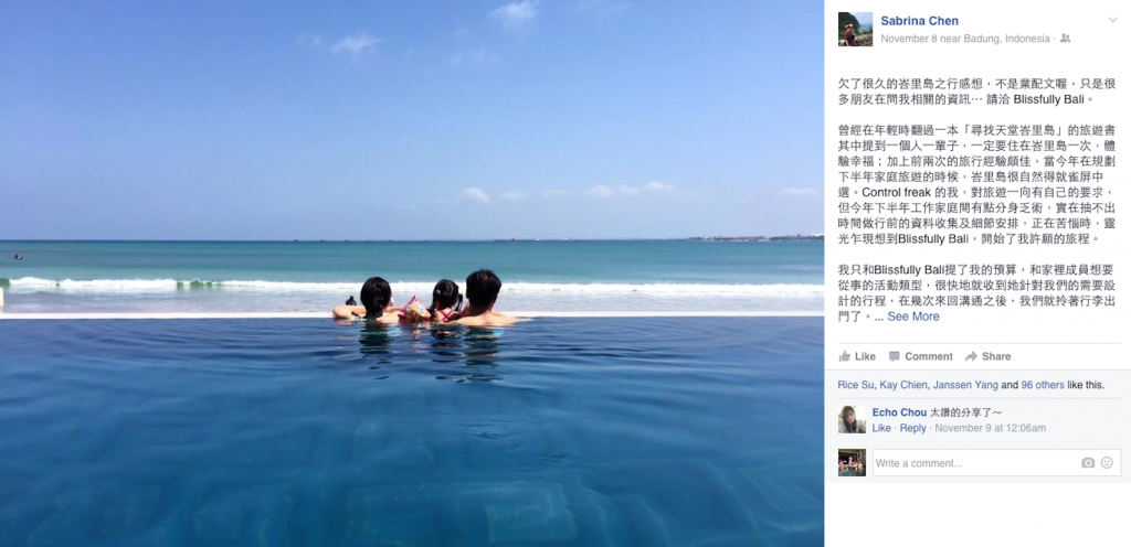 客戶推薦Feb.05.2016謝謝BlissfullyBali 讓我們敢帶三個小孩出門旅行生了第三個小孩後,最想望的就是出國渡假放空之旅,但是一想到兩個大人要對付三個小孩,光想就半條命,更何況是付諸實行? -