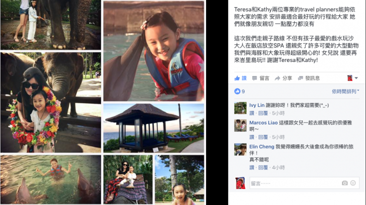 這次我們走親子路線 不但有孩子最愛的戲水玩沙 大人在飯店放空SPA 還親炙了許多可愛的大型動物 我們與海豚和大象玩得超級開心的! 女兒說 還要再來峇里島玩!! 謝謝Teresa和Kathy!