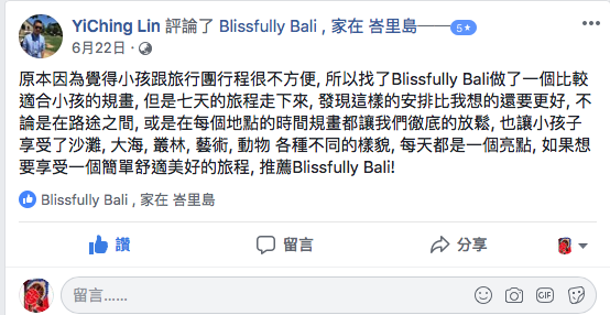 客戶推薦Apr.27.2018從蜜月到有小孩回到峇里島都是Blissfully Bali 給我的美好假期這次的旅行決定的有點倉促,好在有Blissfully Bali 幫忙規劃行程,從蜜月到現在有孩子總是知道我們要的啊~ -