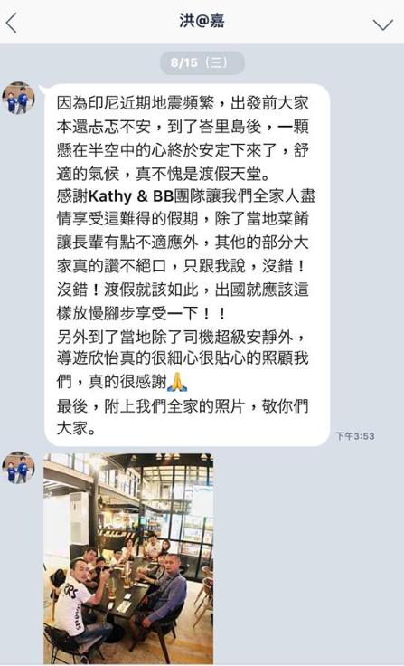 客戶推薦Aug.11.2017頭一回有了渡假的感覺的峇里島旅行, 謝謝BB整個溝通聯絡的過程都非常愉快。而行程中在導遊IMA的悉心照顧下,我們盡情地享受了當地的人文風情。 -