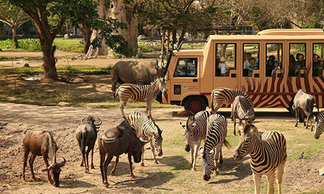 峇里島野生動物園 冒險小屋渡假酒店是間位在野生動物園內的度假酒店,這裡距離市中心僅19 Km,離機場差不多為50分鐘的路程。 這間酒店就真的位在於野生動物園內,所以景歡上非常的特殊可以就在酒店的陽台上觀看在園區內的各種動物且可以與他們互動,不僅如此還可以在五點過後動物園關園且遊客都離開之後與動物園管理員一起進入無人動物園內餵食動物,且在夜晚可以就在飯店房間內聽到園內動物的聲音要是幸運的話還可以看到夜行性動物,是個非常適合親子共同旅行的酒店。