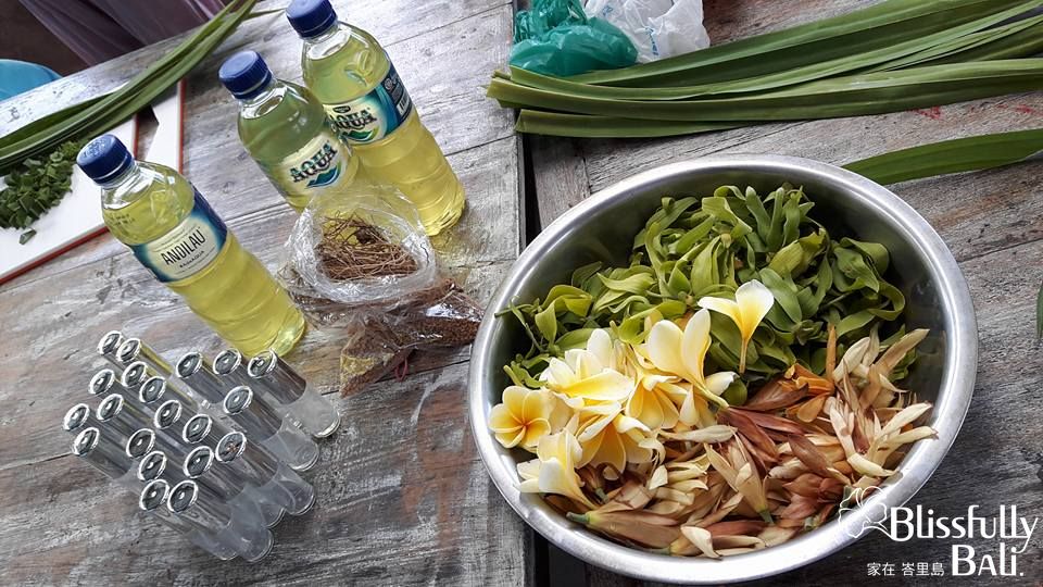 所有製作Canang的素材全部都取之於大自然, 包括竹葉 香蕉葉 鮮花還有米飯 , 這當中除了固定用的釘書針外全部都是可以回歸給大自然分解的, 從中還有了少用塑膠用品的概念。