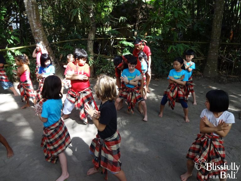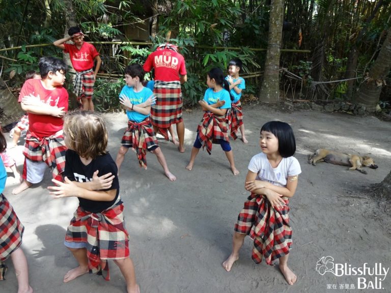 另外一次的校外教學是去認識峇里島上的原住民 ,穿上跟他們一樣的裙子學跳迎賓舞 ,場上的大哥哥們很細心的教導小朋友。