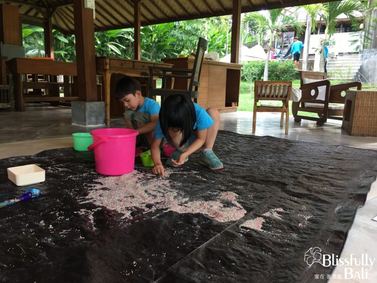 要是遇到爸爸媽媽的活動時間比較長放學時還沒回來,還特別安排了一些藝術家幫孩子上課後的Art Class , 猜得出來他們在做什麼嬤? 他們在有各種顏色的沙子內找出等等作品要用的材料 ,這兩位小朋友非常安靜的在這找了半小時。
