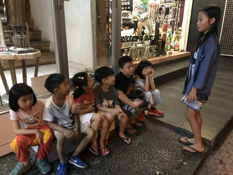 有伴就算在路邊等車也一點都不會無聊,大姐姐正在跟他們講遊戲規則大家都好專心喔 。