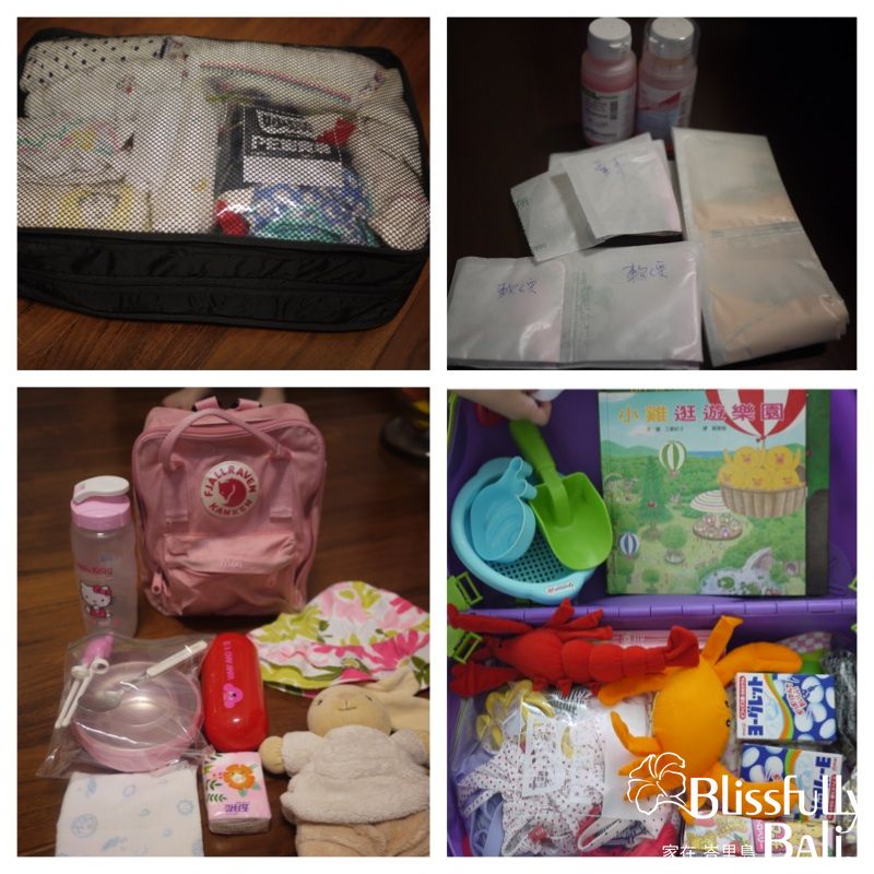 衣 : 在打包行李時,利用行李收納袋分別把家裡每個人的行李分開打包,MN 姐妹我幫他們準備了兩套泳裝替換 ,因為峇里島太陽非常強大所以換洗衣服我大概準備了4-5 套左右 (大概八天的旅行) , 除此之外有了上次的經驗尿布只帶了第一天需要使用的量,其餘的等到當地在購買。