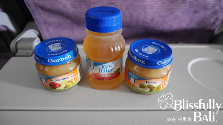 4:飛機上吃什麼: 除了自備的牛奶餅乾外,一樣可以在訂票同時請旅行社跟航空公司要求嬰兒餐及兒童餐,嬰兒餐的話在一上飛機之後空姐就會送上這盒嬰兒食品,有好幾瓶的嬰兒蔬菜水果泥及果汁,這些都非常足夠餵飽嬰兒或是打發無聊的時間。
